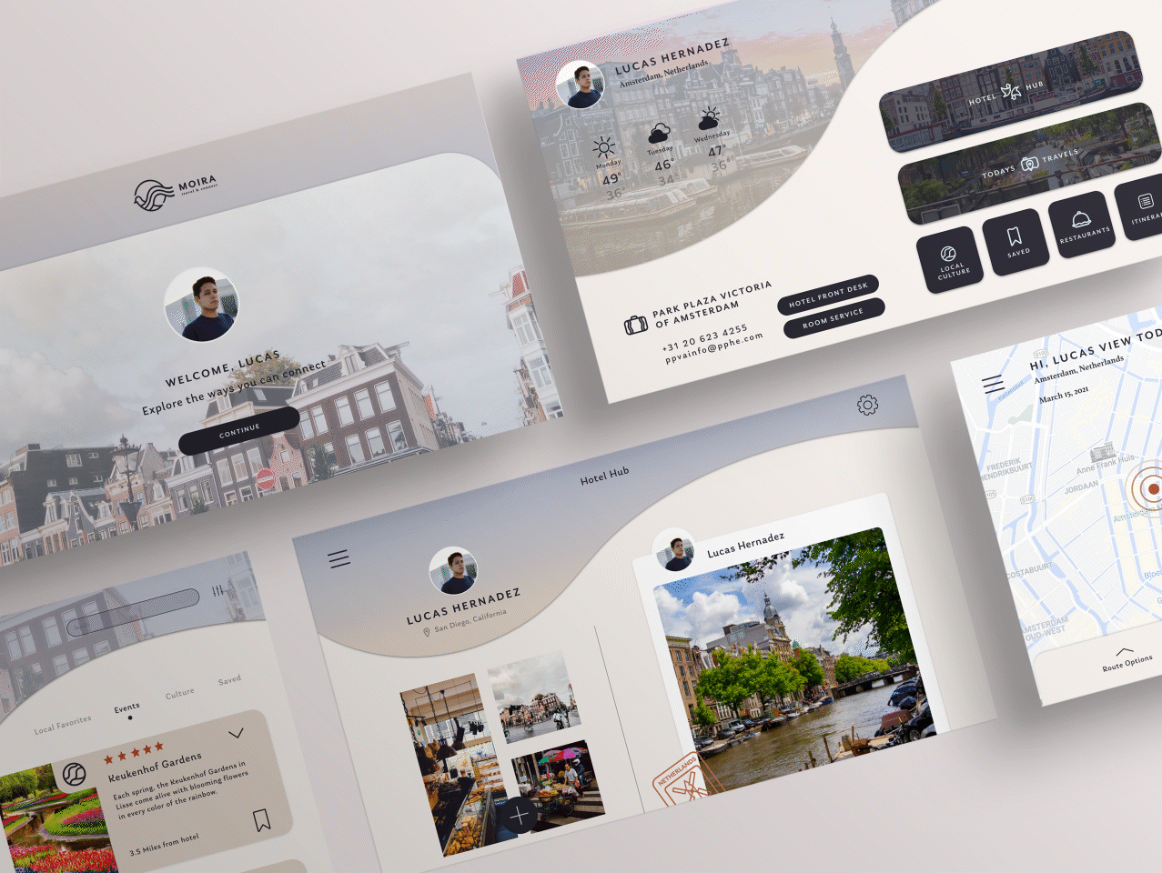 Traveling can be challenging and overwhelming. In order to reduce stress and keep the joy in traveling, we created Moira. Moira is a hotel interface that has a corresponding app, which helps you find great places and activities in the area you are staying. It also allows you to connect with others staying in the hotel and see all the unique destinations and activities they are doing during their stay.