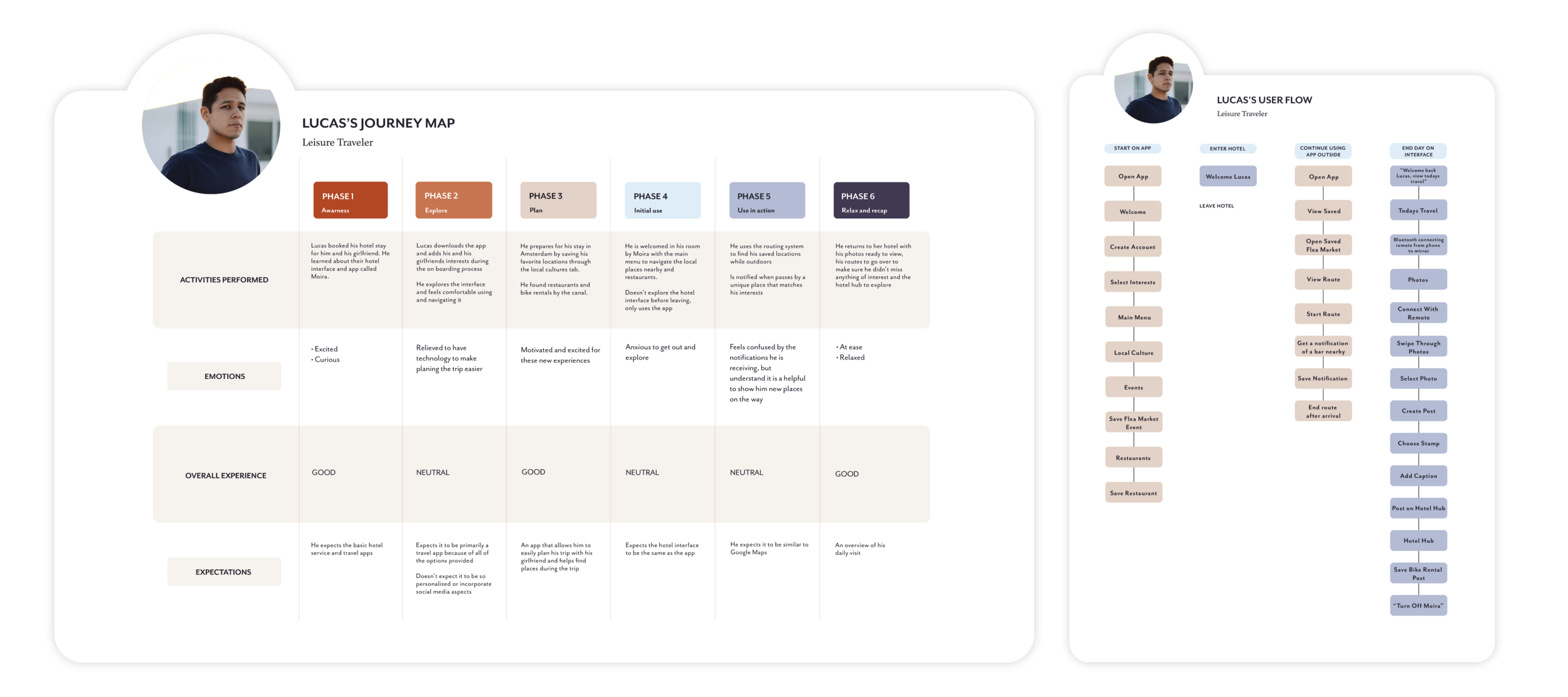The general goal for each user flow was for the users to be able to search Moiras interface to find places and activities they wanted to save. Each persona has different interests and saved places based on what they wanted to do. The user flows also showed how the personas used their saved places on their phone and how they used the interface when they got back to their hotel room. Working on the user flows and journey maps simultaneously allowed us to revise our problems thus impacting our UX design. For example in the beginning we noticed there were too many buttons for the user to go from one page to another, so we minimized the number of clicks as much as possible.