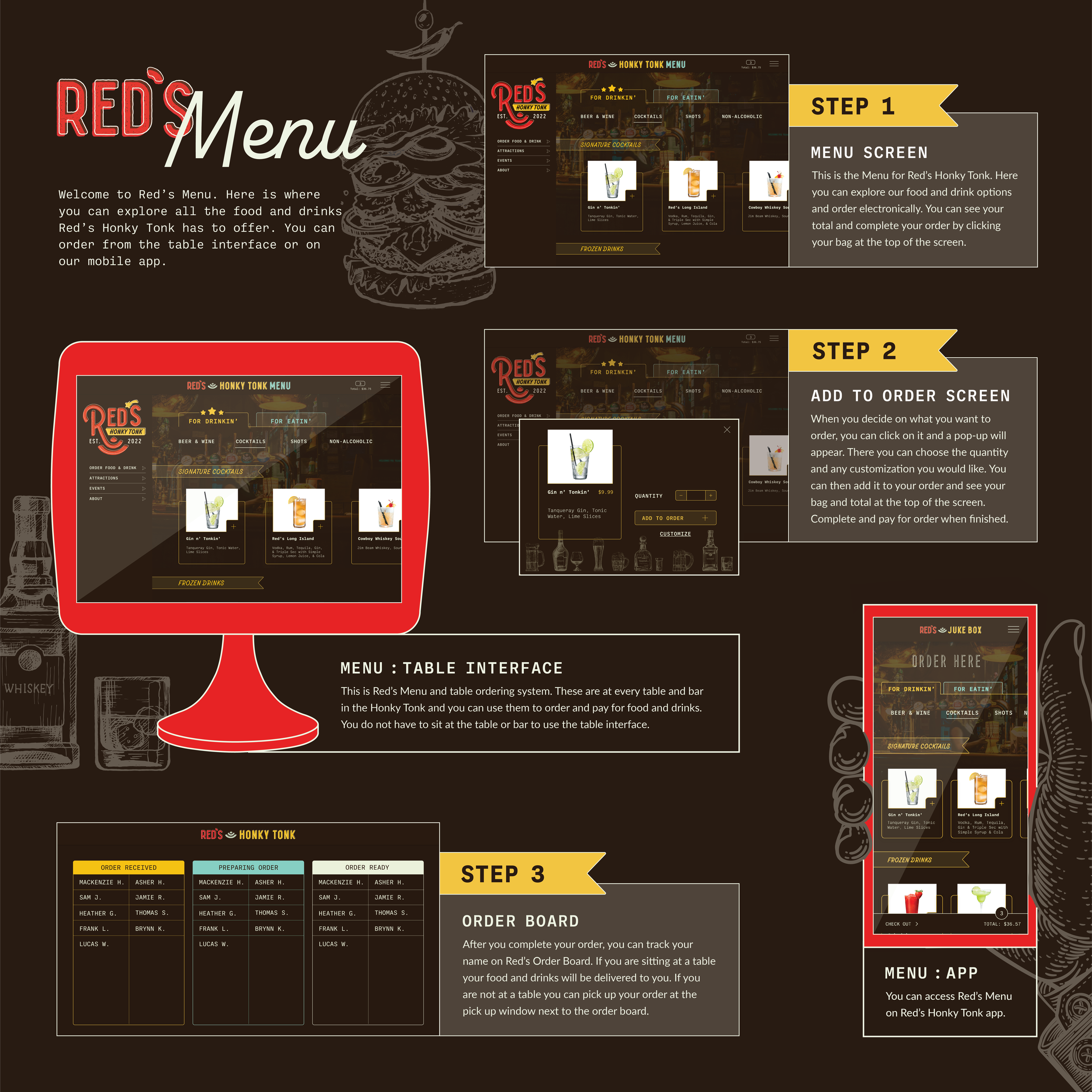 Each digital experience at Red’s Honky Tonk is a unique attraction designed to make a honky tonk bar a more interactive experience. There are three floors to the Honky Tonk with a different experience on each. I designed multiple infographics that highlight each experience Red’s has to offer. These experiences can be accessed in Red’s Honky Tonk, as well as on Red’s Honk Tonk app.